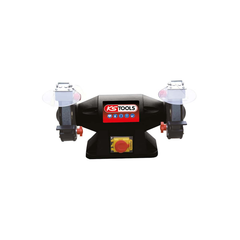 Touret KS TOOLS Version meules - 520W - 430mm - 500.8458, le touret est le parfait appareil pour affûter, ébavurer, corriger et découper. Il dispose d'une tablette porte outils réglable. Pour une sécurité l'optimale, le touret dispose d'un bouton d'arrêt d'urgence avec bobine anti-redémarrage.