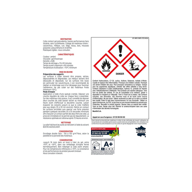 La colle néoprène 1400 BOSTIK 125ml est une colle contact avec durcisseur incorporé pour le caoutchouc, cuir, tissus, métaux, liège, tissus, bois, mousses polyéther et polyuréthane, stratifiés, plastiques rigides. Considérée comme une colle polyvalente hautes performances pour bois, métaux et plastiques, elle s'applique à l'aide d'un pinceau ou d'une spatule crantée fine.