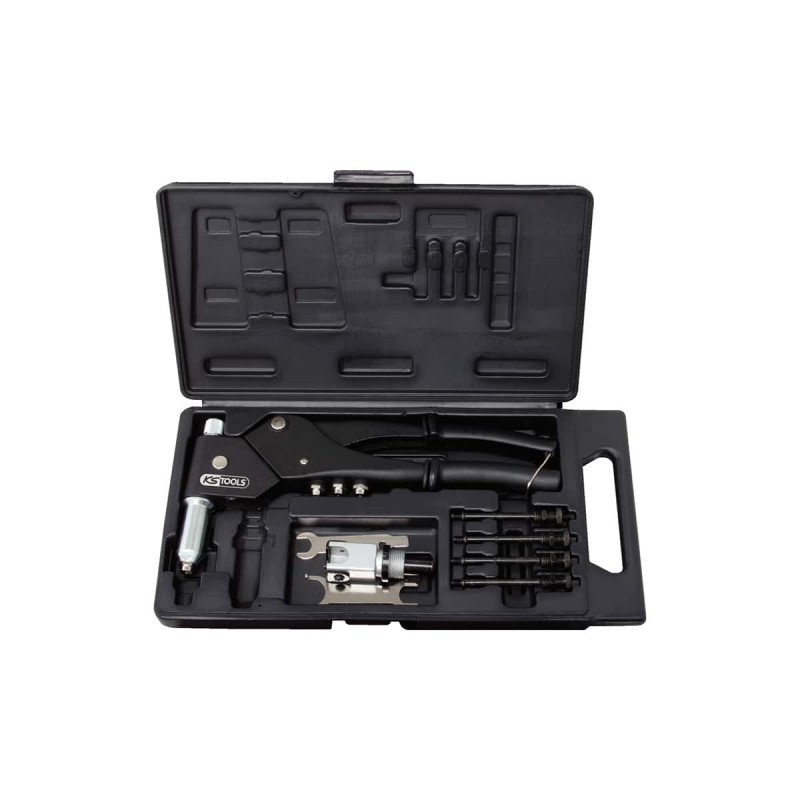 Coffret de pince à riveter KS TOOLS Écrous aveugles et chevilles - 10 pcs - 150.9610, la pince à riveter permet d'assembler des pièces métalliques au moyen de rivets. Idéal dans le secteur de l'industrie mécanique et automobile, la pince dispose d'une tête pivotante à 360°.