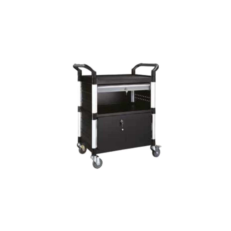 Servante à tiroir 250 KG - 3 plateaux 1 tiroir et 1 coffre - 85x48x100cm, servante polyvalente robuste avec ses montants en aluminium extrudé et ses 3 plateaux en polypropylène et fibre de verre. La servante est équipée d'un tiroir et d'un coffre qui permettent de ranger les outils. Les deux peuvent être fermés à clé. La servante est facilement déplaçable avec ses poignées de chaque côté et ses 4 roulettes pivotantes dont 2 munies de frein. Elle supporte jusqu'à 250 kg.