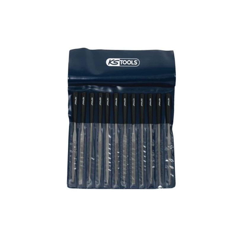 Jeu de 12 limes aiguilles KS TOOLS - 140.3050, ce jeu de 12 limes propose 2 limes plates, 2 limes rondes, 2 limes entrées, 1 lime triangulaire, 1 lime triangulaire extra-fine, 1 lime carré, 1 lime couteau, 1 lime demi ronde, 1 lime feuille de sauge.