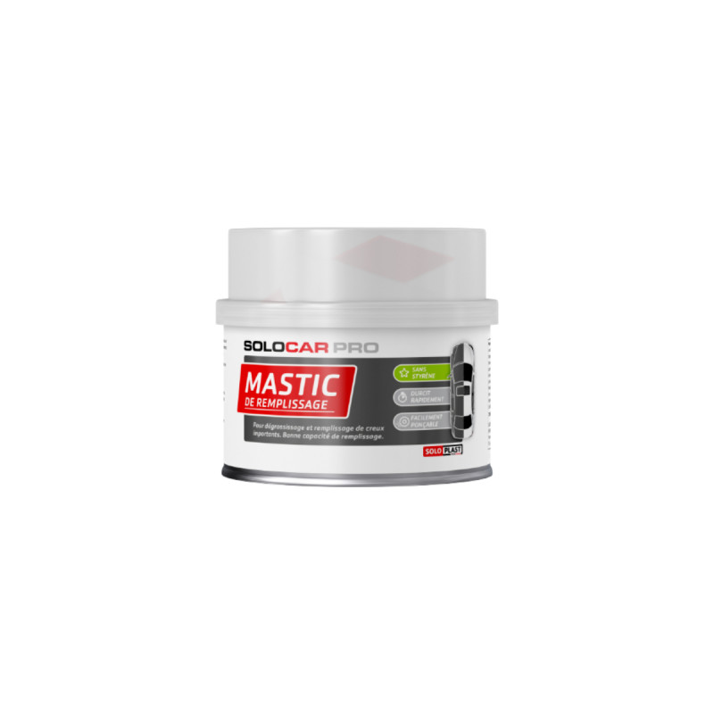 Le mastic de remplissage Solocar Pro avec durcisseur 500g convient au dégrossissage et au remplissage de creux important. Ce mastic Solocar Pro de 500 gr est fourni avec un durcisseur.