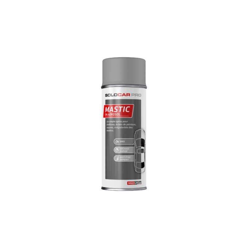 Le mastic en aérosol Solocar Pro 400ml est un mastic en aérosol pour éraflures, éclats de peinture, rayures et irrégularités des mastics. De couleur gris, son séchage est rapide et permet un travail de qualité. Doit être repeint.
