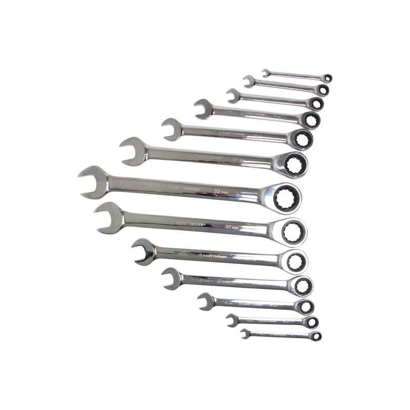 Cette caisse est livrée pleine, avec 13 clés mixtes à cliquet, de 8 à 32 mm.