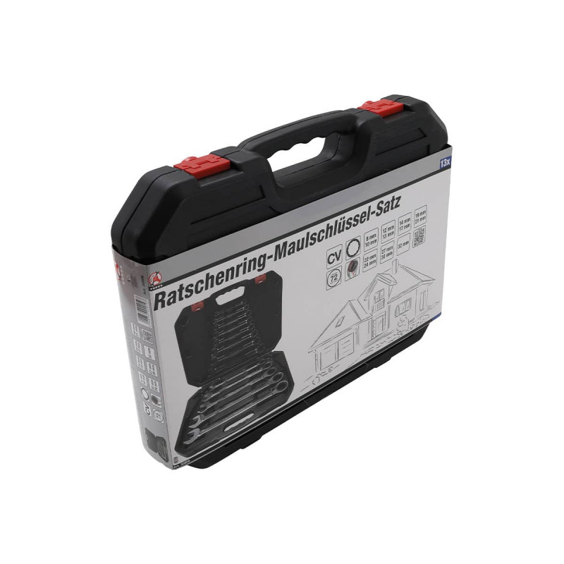 Caisse de clés mixtes à cliquet BGS - 8 - 32 mm - 13 pcs - 30006, facilement transportables grâce à leur mallette avec poignée, vos clés seront également toujours à leur place, bien rangées.