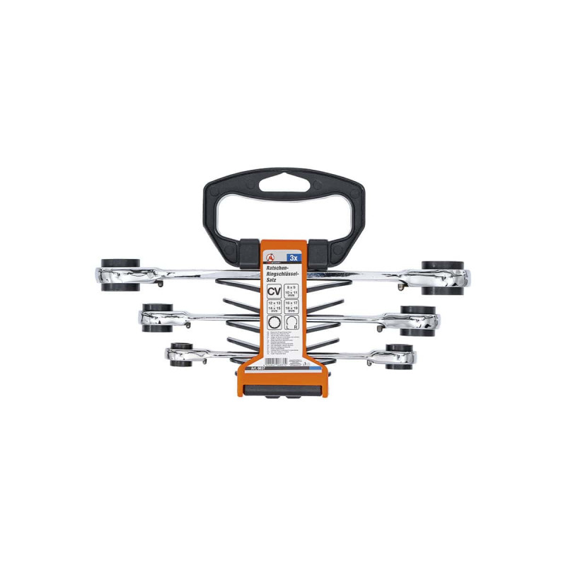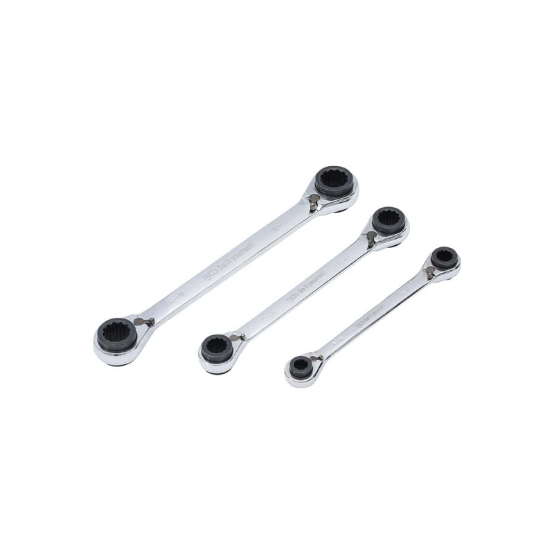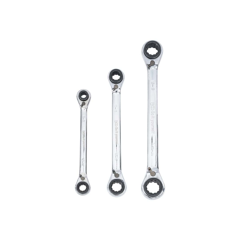Jeu de clés à cliquet 4-en-1 BGS - 3 pcs - 6837, ces clés à cliquet regroupent 4 clés en une seule vous offrant davantage de possibilité pour le serrage/desserrage.