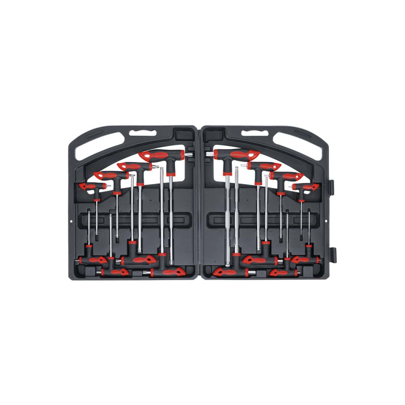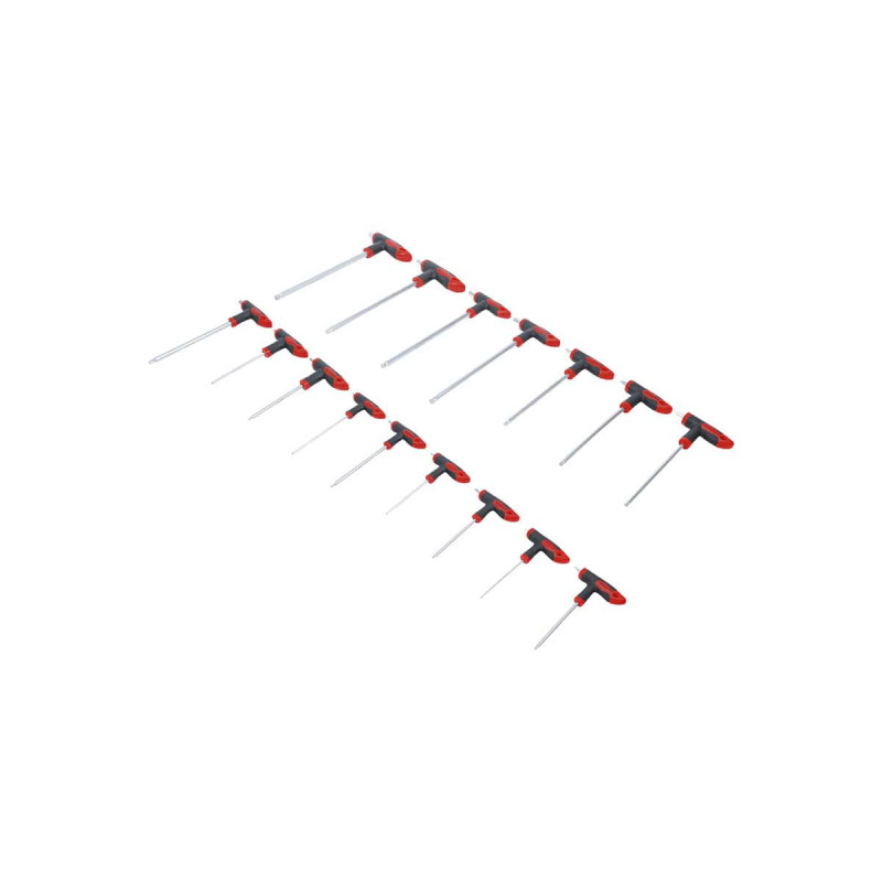 Clés poignée T BGS - 16 pcs - 90, utilisées pour visser ou dévisser, ces clés avec transmission par 6 pans intérieurs, extrémité longue avec tête sphérique, comprennent une poignée en T ergonomique, pour l'utilisation efficace des deux extrémités de la clé.