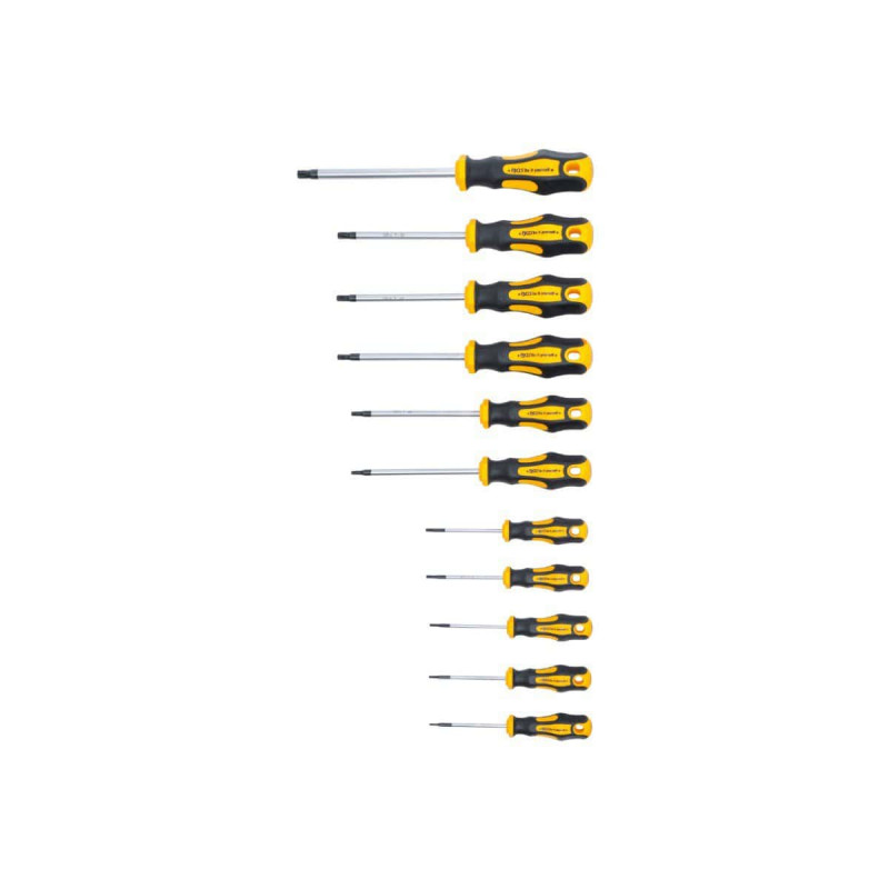 Jeu de tournevis profil en T avec perçage frontal BGS - 11 pcs - 7845, idéal pour les professionnels et les particuliers, ce jeu de 11 tournevis à profil en T (pour Torx) vous assistera au quotidien avec une meilleure accroche dans la tête de vis grâce à ses pointes magnétiques, ainsi qu'un meilleur confort de travail avec ses poignées ergonomiques.