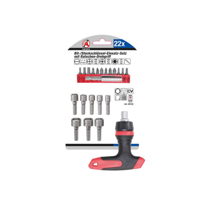 Jeu d'embouts et douilles poignée en T à cliquet pour embouts réversibles BGS - 22 pcs - 20122, ce jeu d'embouts et douilles, comprenant une poignée rotative à cliquet avec aimant, facilitera le changement rapide d'embouts pour serrer/desserrer vos vis et écrous.