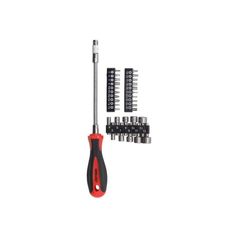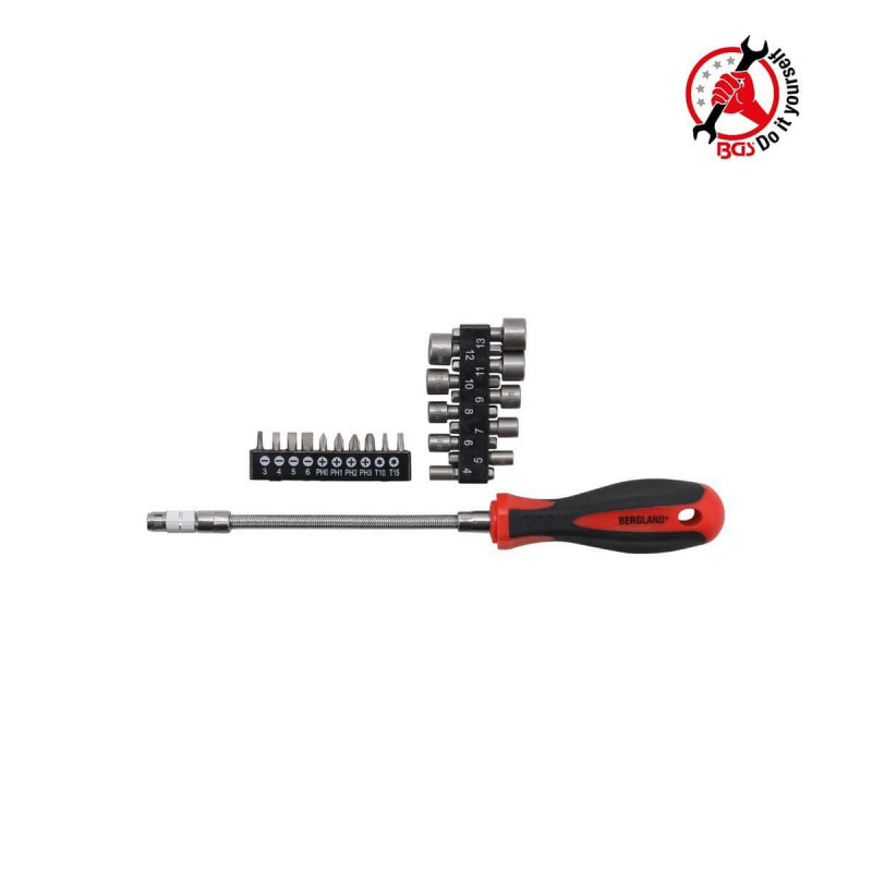 Jeu d'embouts de tournevis avec tige flexible BGS - 31 pcs - 20131, facilitez votre travail avec ses embouts plats, cruciformes, etc. et le tournevis flexible possédant une poignée ergonomique offrant plus de maintien et de précision que d'autres tournevis du marché.