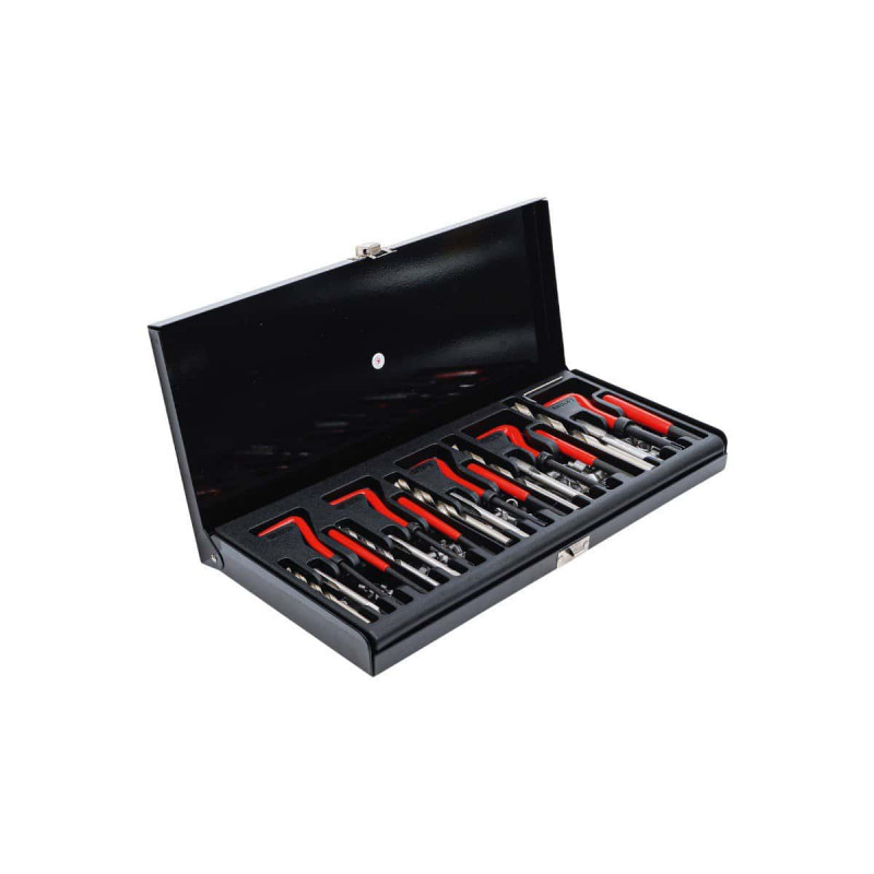 Coffret de filets rapportés BGS - 130 pcs - 19500, réduisez les besoins de temps et donc les coûts avec ce coffret de filets rapportés facilement transportable. Il comprend forets, inserts de filetage, tarauds, etc.
