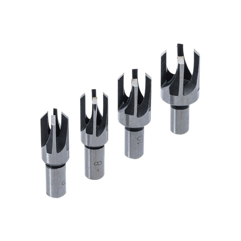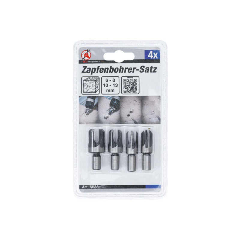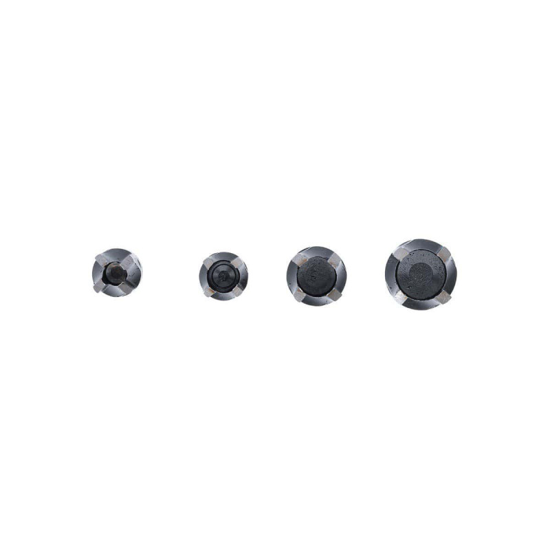Jeu de forets de trou de goujon BGS - 4 pcs - 6838, pour la fabrication de bouchons / fiches en bois, ce jeu comporte quatre forets de bouchons avec les dimensions suivantes : 13 x 6 x 20 mm, 13 x 8 X 20 mm, 16 x 10 x 20 mm et 19 x 13 x 20 mm.