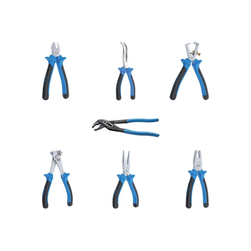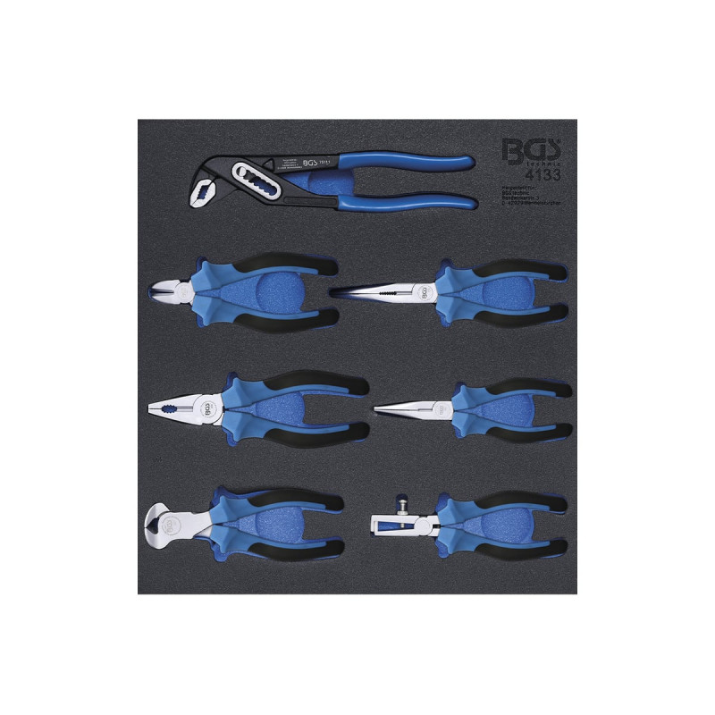 Insert de servante d'atelier BGS TECHNIC - 7 pcs - 4133, avec son jeu de sept pinces (pince multiprise, coupante diagonale suédoise, téléphone coudée, téléphone droite, universelle, coupante frontale, pince à dénuder), soit tout ce qu'il faut à tout bon bricoleur qui se respecte !