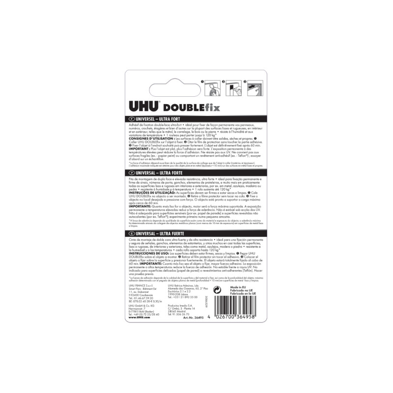 Laissez vos outils de bricolage de côté, avec le ruban adhésif UHU Doublefix 36495 vous pouvez fixer des objets lourds sur des surfaces, à l'intérieur ou l'extérieur. Il offre une adhérence de fixation double face exceptionnelle pour monter facilement vos panneaux, patères, objets décoratifs et autres. Ultra résistant, le ruban est adapté pour la plupart des surfaces lisses comme le métal, les carrelages, verre...