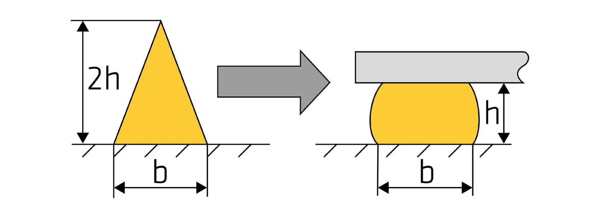 Il est à noter que la viscosité s'accroît quand il fait frais. Pour une application aisée, réchauffez la colle à la température ambiante. Pour assurer une épaisseur de colle uniforme, il est suggéré de l'appliquer en forme triangulaire (comme indiqué dans le croquis ci-dessous).