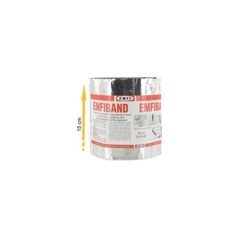 La bande d'étanchéité autocollante à froid ocre EMFI 15cm x 10m est à base de bitume modifié surfacé d'une feuille d'aluminium. Grâce à ces bandes d'étanchéité vous pourrez effectuer des travaux d'étanchéisation et réparer différentes surfaces notamment, l'asphalte, le feutre bitumineux, le verre, les métaux, le bois, les matières plastiques, le béton, le mortier, les peintures, le plâtre, les briques, les ardoises, les tuiles, les pierres, les mousses isolantes et bien d'autres encore.
