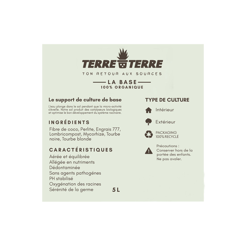 Microdosé, le Terreau TERRETERRE - La Base - 5L, est conçu comme produit de base pour aider à la croissance des semis. Sa composition allégée en nutriments procure à cette terre un équilibre parfait pour le développement du système racinaire tout en produisant des catalyseurs biologiques.