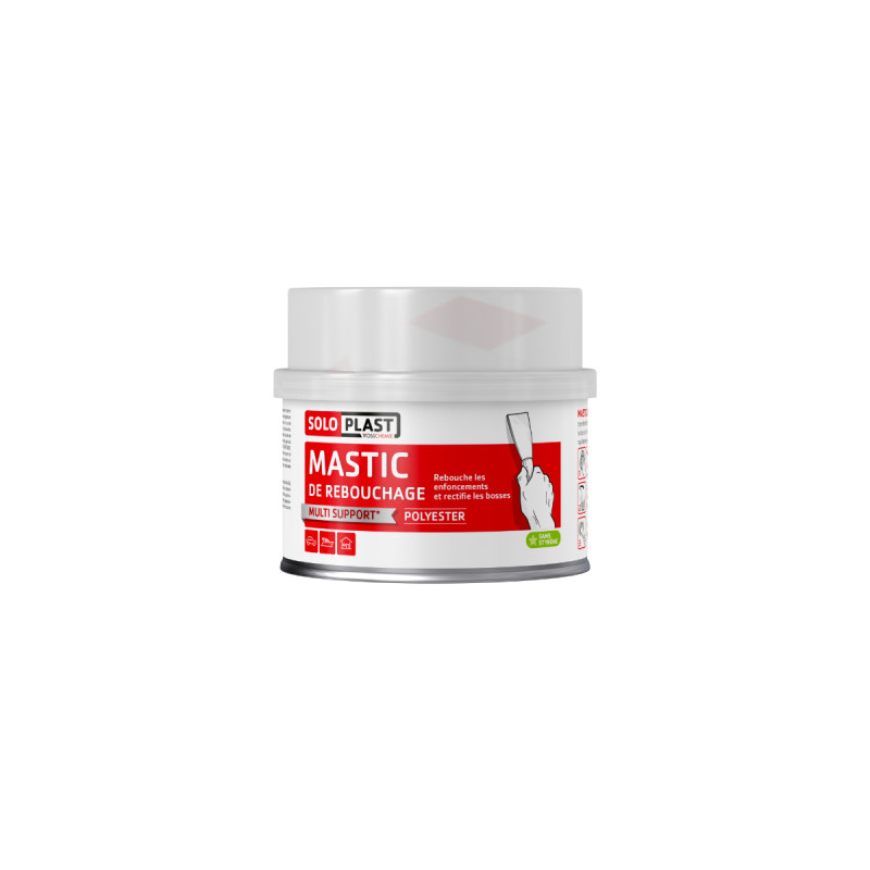 Le Mastic de rebouchage SOLOPLAST 188g avec durcisseur est un mastic de remplissage et de dégrossissage de creux importants sur du métal, carrosserie, bois, stratifié polyester et béton. Il peut s'appliquer en toute épaisseur sans risque de crevasse ou de fendillement.