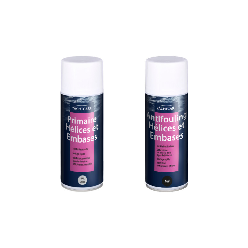 Avec le Kit YACHTCARE primaire et antifouling pour hélices et embases - noir- 2x 400 ml, vous avez une base d'accrochage qui est le primaire et un antifouling ( la peinture), tous deux spécialement conçus pour vos hélices et embases. En aérosol, l'application dans les zones difficiles d'accès est très facile et d'une grande homogénéité sur toute la surface métallique. De couleur noire, l'antifouling offre une grande protection contre les salissures.