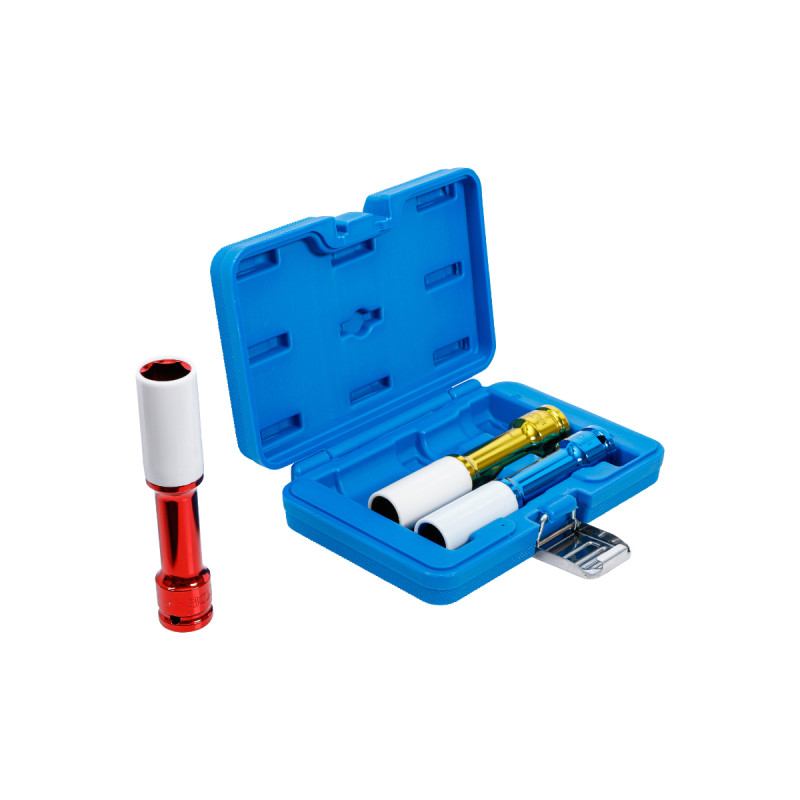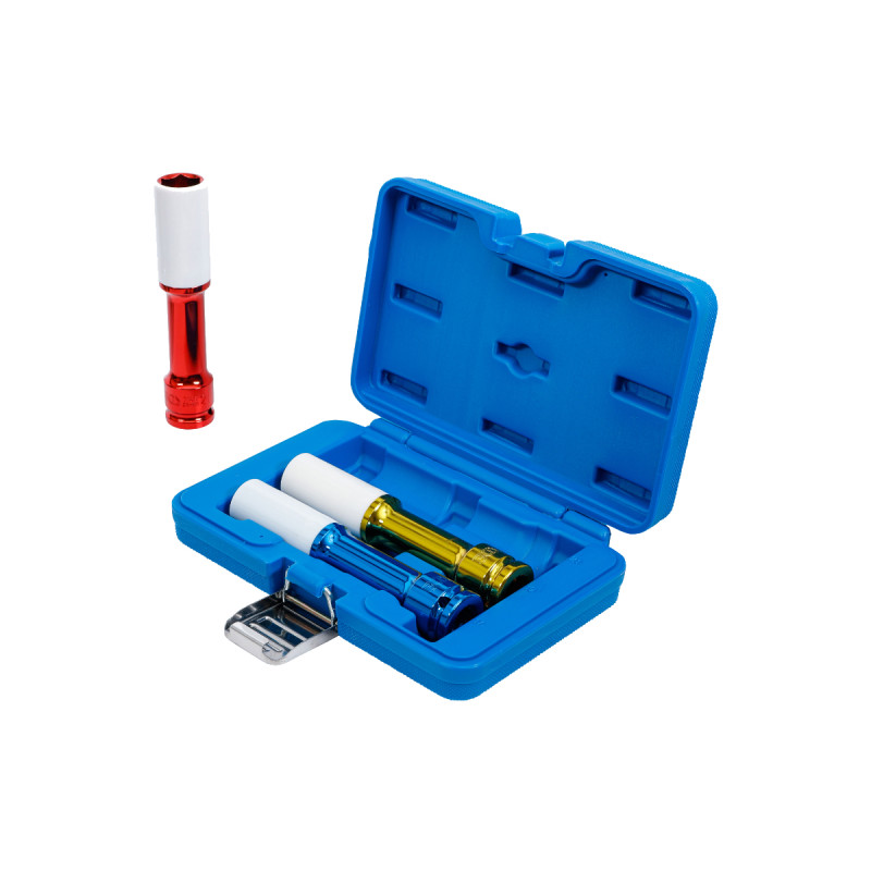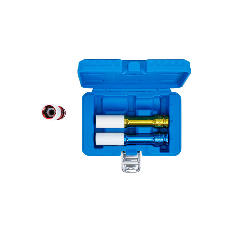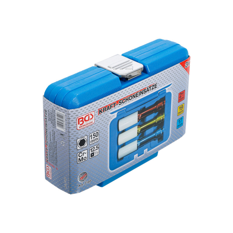 Ce coffret de douilles à choc extra longues avec protection BGS TECHNIC - 12,5 mm - 3 pcs - 7100 contient 3 douilles extra longues (150 mm) pour jantes à base creuse, de 17, 19 et 21 mm, carré 12,5 mm (1/2"). Elles sont adaptées pour clé à choc ainsi que pour cliquet. Leur confection est élaborée, avec une enveloppe en plastique et un insert en plastique qui protègent les jantes en aluminium. Dotées de réception à goupille de calage et de joint en caoutchouc, elles sont facilement reconnaissables grâce aux noix à code couleur.