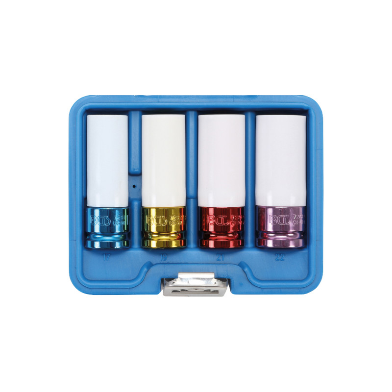Ce coffret de douilles à choc avec protection BGS TECHNIC - 12,5 mm - 4 pcs - 9847 contient 4 douilles avec transmission par carré femelle 12,5 mm (1/2"), de 17, 19, 21 et 22 mm. Elles sont adaptées pour clé à choc ainsi que pour visseuse manuelle. Leur confection est élaborée, avec une gaine et un insert en plastique qui protègent les jantes en aluminium. Dotées de réception à goupille de calage et de joint en caoutchouc, elles sont facilement reconnaissables grâce aux noix à code couleur.