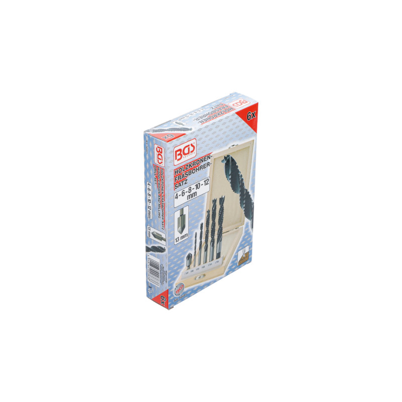 Jeu de mèches à bois fraisées BGS TECHNIC - 6 pcs - 50401, pour un perçage, fraisage de qualité. Ces mèches à bois contiennent 4 lames épaules ultra aiguisées, des têtes de couronne 5 lames et une pointe de centrage. Leur profil hélicoïdal spécial et leurs dentures de fraisage et permet un transport des éclats rapide. Le jeu contient également une fraise conique pour le polissage et le formage des trous.