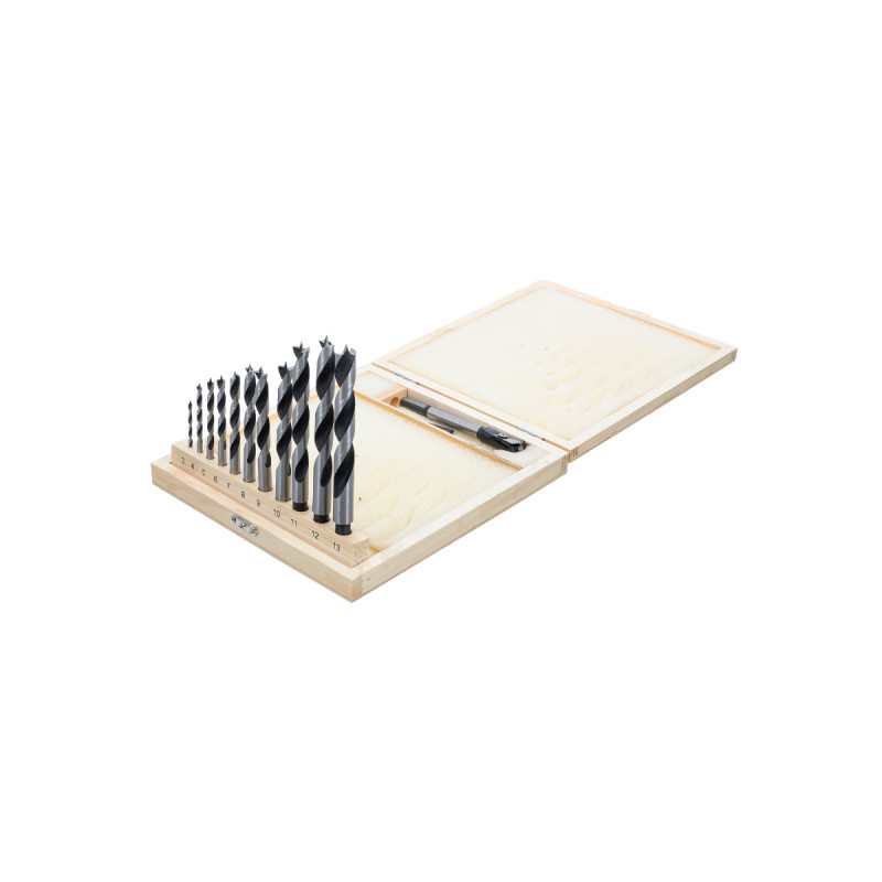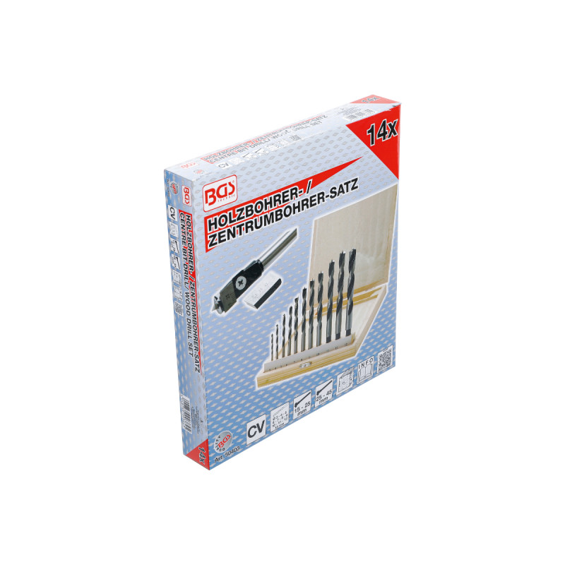 Jeu de mèches à bois et système de centrage BGS TECHNIC - 14 pcs - 50403, pour un perçage précis, vous trouverez dans cette boîte en bois un système de centrage réglable entre 15 mm et 45 mm. Ce système est parfait pour réaliser un avant-trou centré. Vous trouverez également 11 forets à bois, avec pointe de centrage.