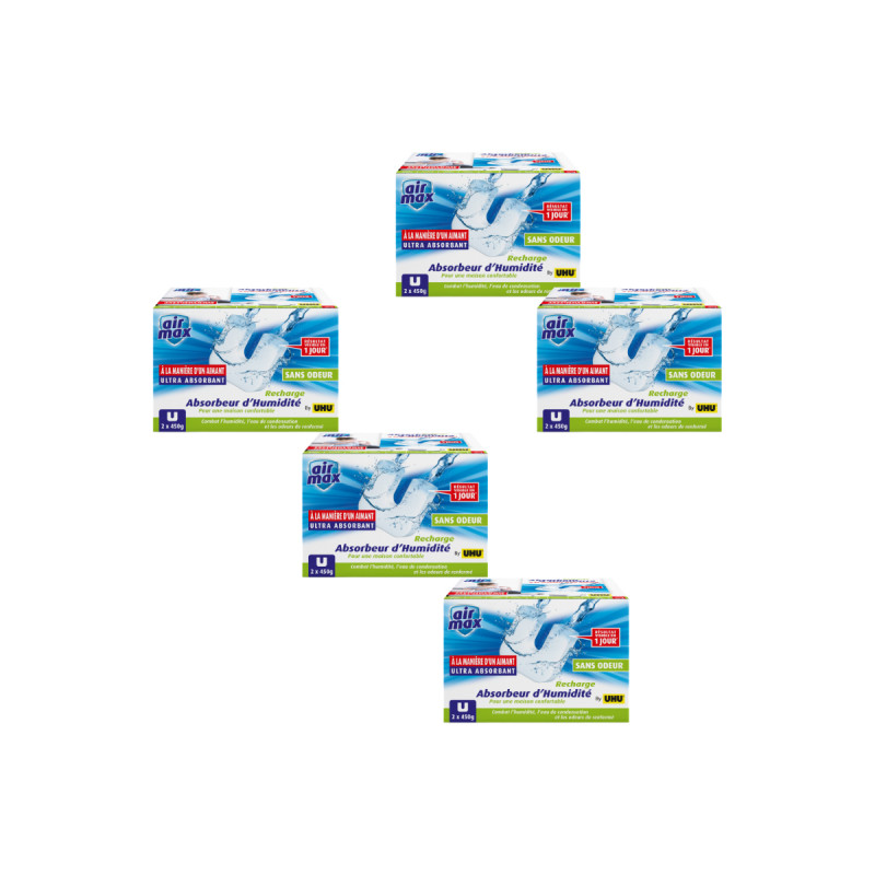 Un Pack de 5 lots de 2 recharges pour absorbeur d’humidité Airmax by UHU - 10x450g - 34848