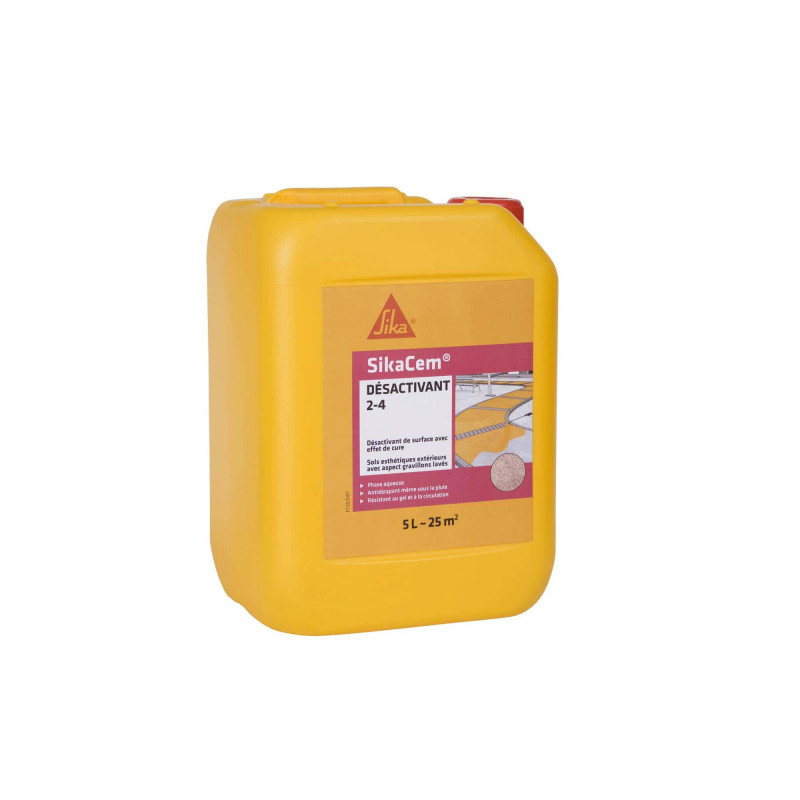 Désactivant de surface SIKA - SikaCem - 2-4 - 5L, un produit particulièrement adapté à l’aménagement des sols extérieurs (chaussées béton, zones piétonnes, terrace, parvis, trottoirs). Ce désactivant, sous forme d’émulsion aqueuse pulvérisable, offre un excellent pouvoir de cure. Il est un décapant pour béton, laissant un aspect esthétique du type “gravillons lavés” avec une profondeur de désactivation comprise entre environ 2 et 4 mm. A utiliser sur du béton dont les granulats sont compris entre 6 et 12 mm. Désactiver du béton réduit les risques de glissades.