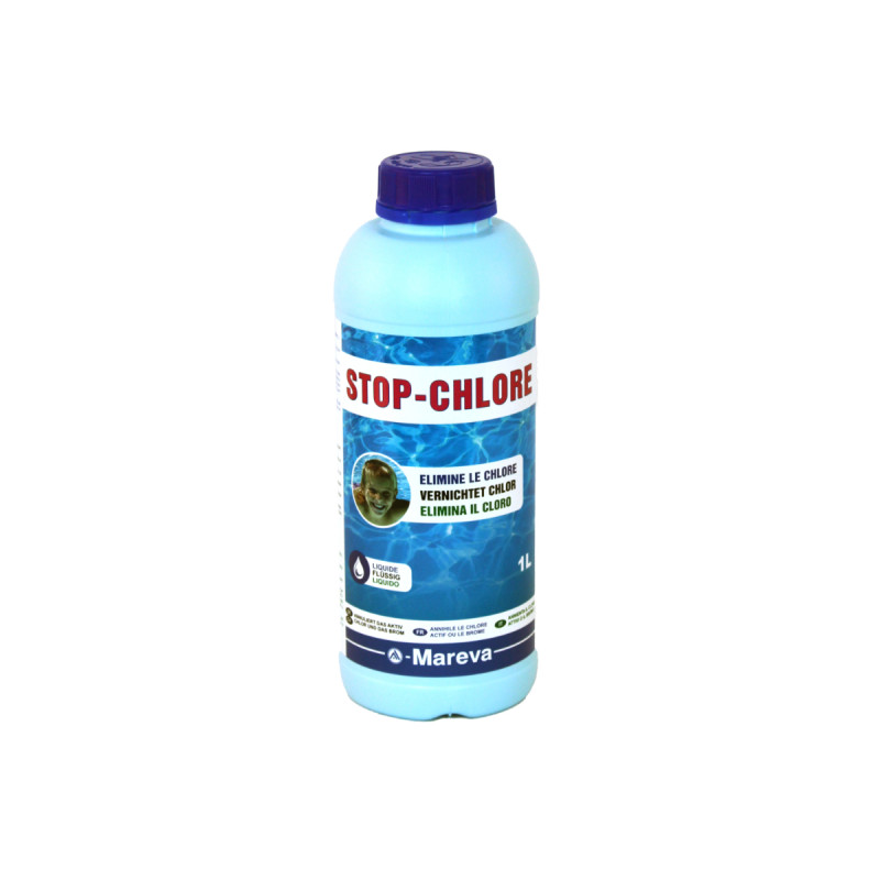 Ce Stop chlore MAREVA - 1 L - 150031U est utilisé pour les piscines traitées au chlore ou au brome ou pour baisser rapidement le taux de produit oxydant dans une piscine.Existe en petit modèle.