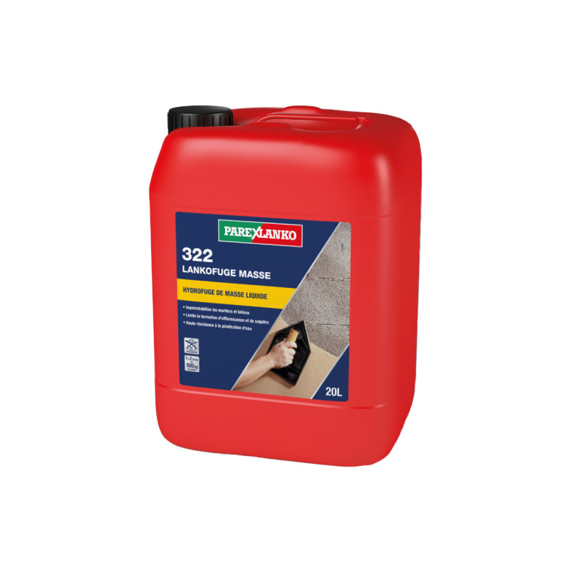 Hydrofuge à incorporer au gâchage des bétons et mortiers 322 LANKOFUGE MASSE PAREXLANKO - 20 L est un hydrofuge de masse, prêt à gâcher. Il permet de réduire de manière importante la capillarité des bétons et mortiers. Il renforce leur imperméabilité et rend étanches les ouvrages. Il s'adapte à tous les types de ciments (hors ciments alumineux).