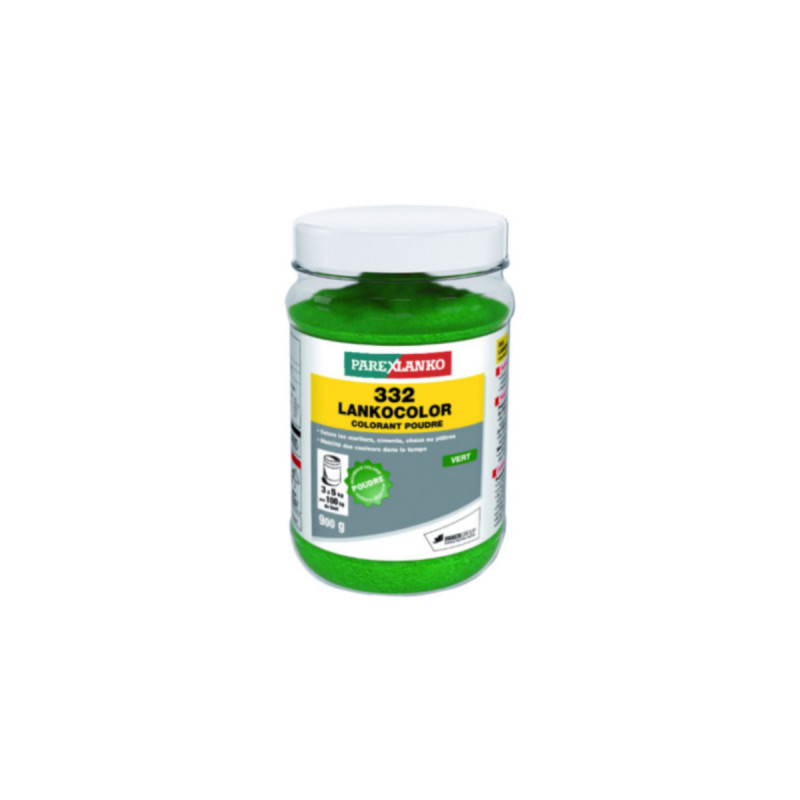 Colorant en poudre 332 LANKOCOLOR PAREXLANKO - mortiers, ciments, plâtres - vert - 900 g, le colorant en poudre qu'il vous faut pour la colorations de vos préparations. Il est idéal pour un usage intérieur, comme extérieur.