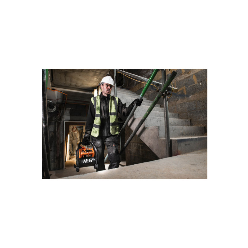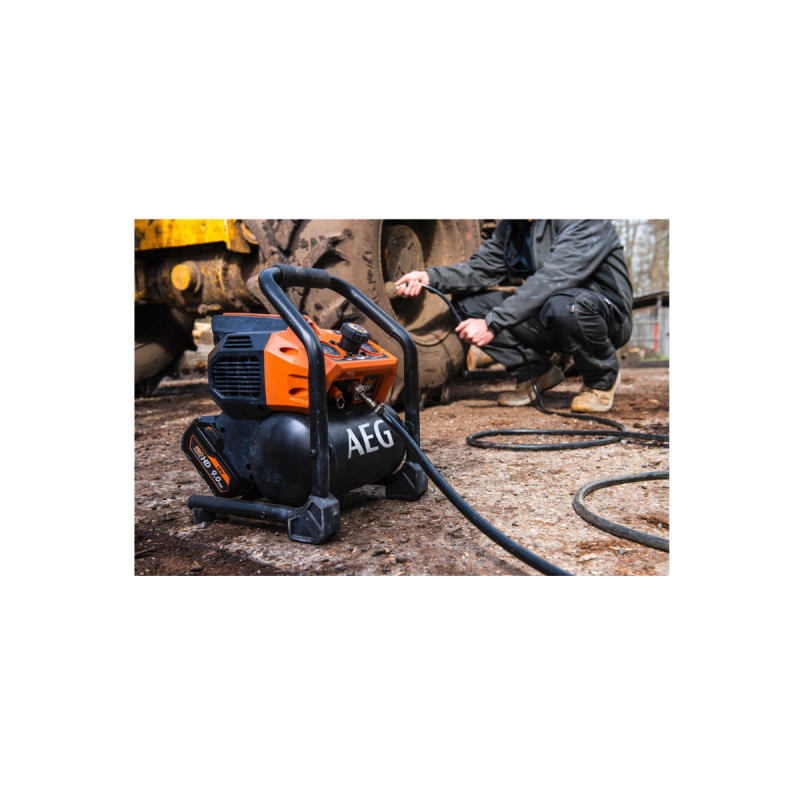 Pack AEG 18V - Compresseur Brushless - Batterie 4.0 Ah - Chargeur - Caisse de rangement, un compresseur proposant une pression max de 30,8 l/min avec une capacité du réservoir de 3,8L. Moteur puissant et résistant avec la technologie Brushless.