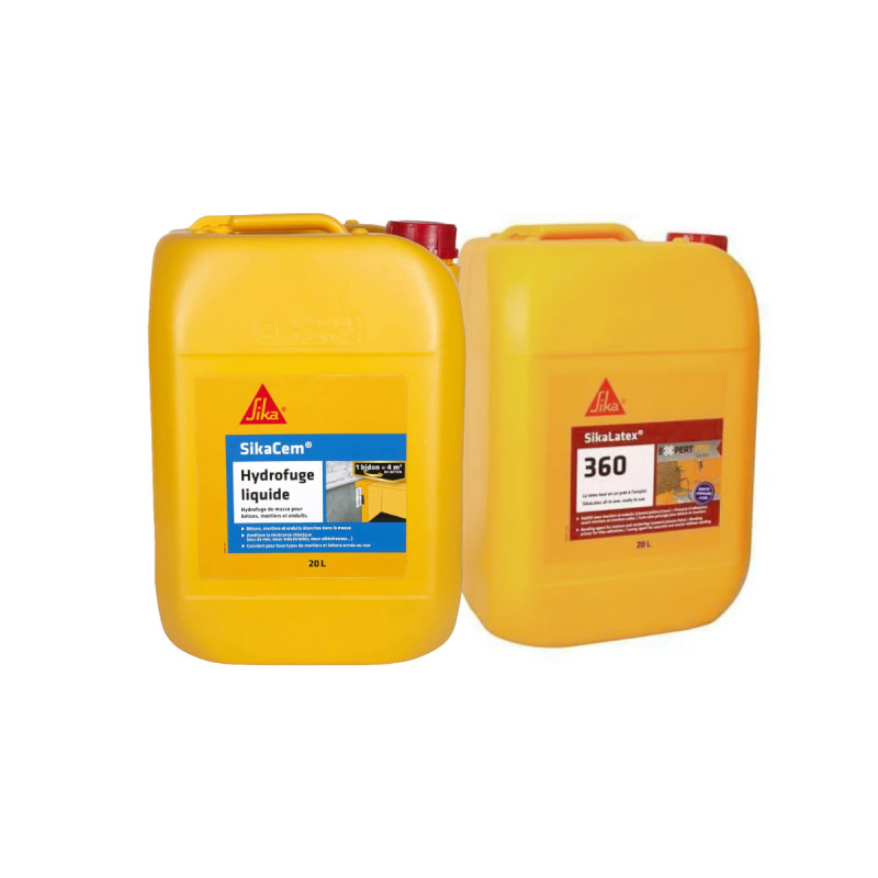 Pack Maçonnerie SIKA - Hydrofuge de masse liquide SikaCem 20L - Résine d'accrochage SikaLatex 360 - 20L, pour imperméabiliser et améliorer l'adhérence du mortier sur tous supports, mêmes les supports lisses. L'hydrofuge de masse liquide SIKA SikaCem - Pour béton et mortier, se combine à la chaux du ciment pour former des cristallisations complémentaires qui obstruent les capillaires du mortier, le rendant imperméable à l'eau. Le produit est garanti sans chlore. Il est sans effet sur la prise et les résistances mécaniques du béton. La résine d'accrochage SIKA SikaLatex 360 est une résine synthétique qui améliore fortement l'adhérence du mortier sur tous les supports, même lisses. Elle rend le mortier plastique et facile à mettre en oeuvre, limitant les risques de fissuration.