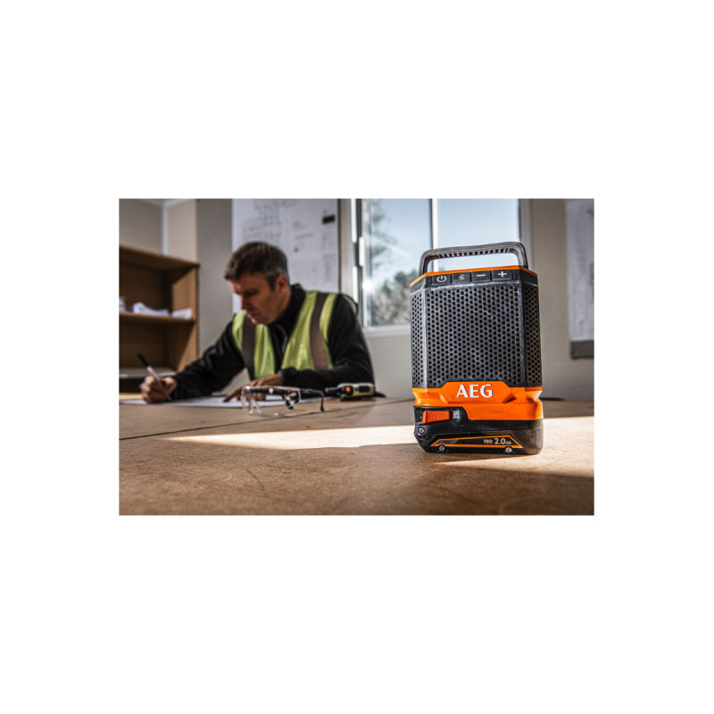 Pack AEG 18V - Enceinte-Radio Bluetooth 30m 30W - Batterie 4.0 Ah - Chargeur, compacte et puissante, elle vous permettra d'écouter la musique sur n'importe quel chantier. Elle fonctionne en bluetooth et donc sans fil, pour une portée de connexion jusqu'à 30 mètres ! Profitez de sa diffusion claire et puissante (30W), d'une prise USB et de la possibilité de sauvegarder jusqu'à 6 stations en mémoire. Elle possède un écran LCD qui la rend facile d'utilisation, et un indice de protection IP 54 pour une bonne tenue dans le temps, contre la poussière et les éclaboussures.