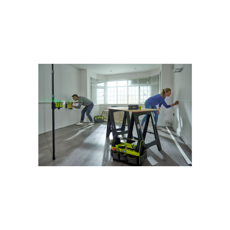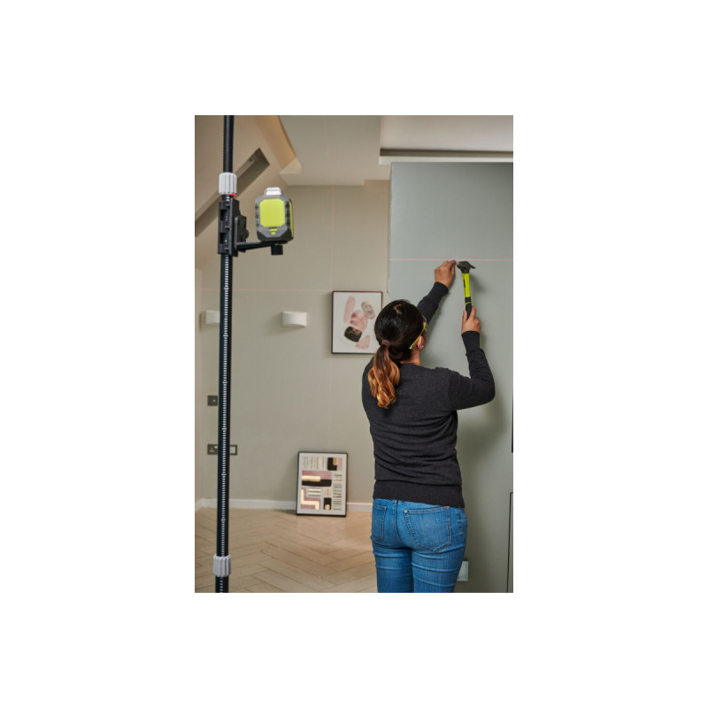 Laser 360° vert - Canne télescopique RYOBI - RB360GLL-K, est idéal pour les applications de nivellement et d'alignement rapides telles que les armoires suspendues, les étagères et les images dans la maison. La technologie liée au laser vert rend les lignes 4 fois plus visibles. Il projette une ligne puissante à 360° et 1 ligne verticale simultanément. Les lignes peuvent être activées individuellement afin de mieux s'adapter à la tâche. Grâce à sa canne télescopique, travaillez dans de grands espaces et couvrez toute la zone grâce à la ligne 360° !