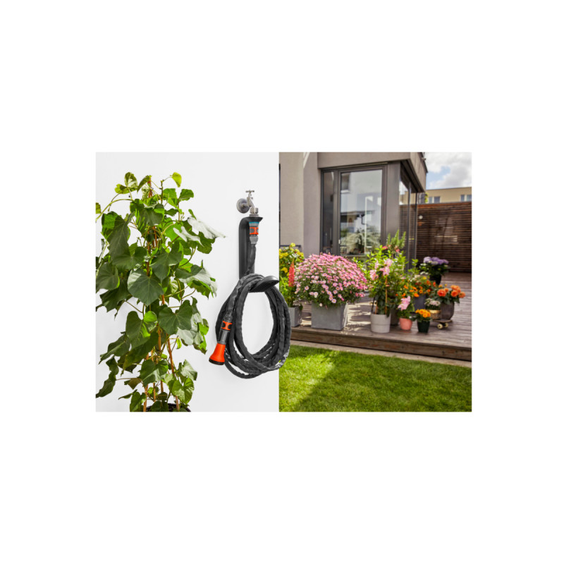 Envie d'arroser votre jardin, petit ou grand ? Rien de mieux que le Kit GARDENA Tuyau d'arrosage textile Liano 10 m - Support TapFix. Avec ce kit, vous aurez tout ce dont vous avez besoin pour arroser votre jardin. À la fois léger et très simple à manier, il est doté d'un anti-vrille et d'un anti-torsion pour l'empêcher de s'abîmer. Ce tuyau est conçu pour être 50% plus léger que ceux en PVC et pour supporter une pression jusqu'à 35 bar. Le pack contient également un support tuyau Liano TapFix qui est l'accessoire utile par excellence pour accrocher proprement un tuyau au robinet. Il se fixe à ce dernier, sans s'appuyer ou endommager le mur, et s'installe sans qu'aucun outil ne soit nécessaire. Il permet ainsi d'enrouler les tuyaux Liano (jusqu'à 20 m de longueur) puis de les poser à l'endroit dédié. Le support est compatible avec les robinets 1/2", 3/4" et 1". C'est la fin des tuyaux laissés au sol ou enroulés n'importe comment.