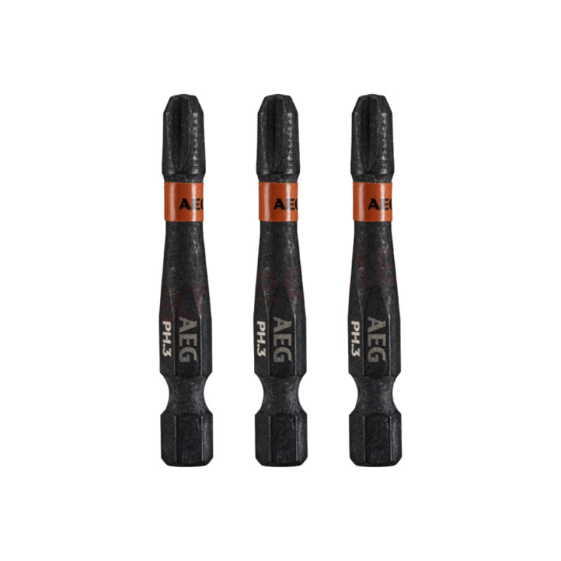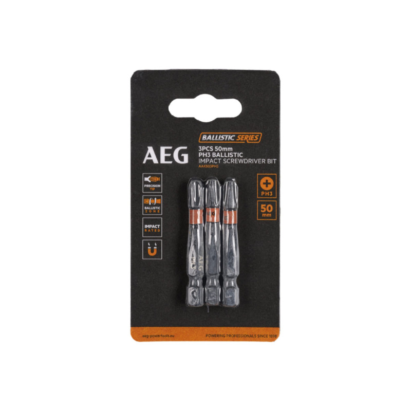 Embouts de vissage balistiques renforcés AEG - 50 mm - 3 pcs - PH3, conçus pour fonctionner avec impact lors du montage et du démontage des fixations. En raison de la zone de torsion à couple élevé, la transmission de force est réduite, ce qui se traduit par une longue durée de vie.