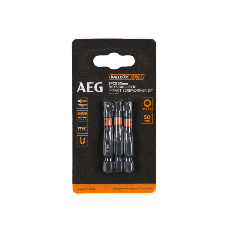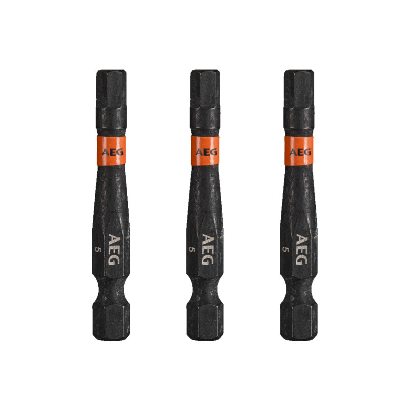 Embouts de vissage balistiques renforcés AEG - 50 mm - 3 pcs - HEX5, conçus pour fonctionner avec impact lors du montage et du démontage des fixations. En raison de la zone de torsion à couple élevé, la transmission de force est réduite, ce qui se traduit par une longue durée de vie.