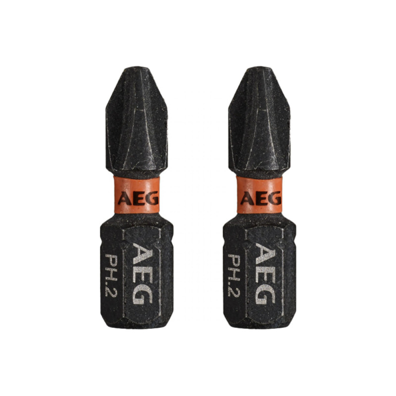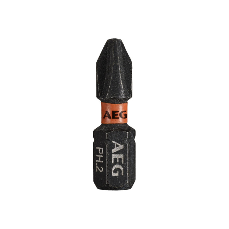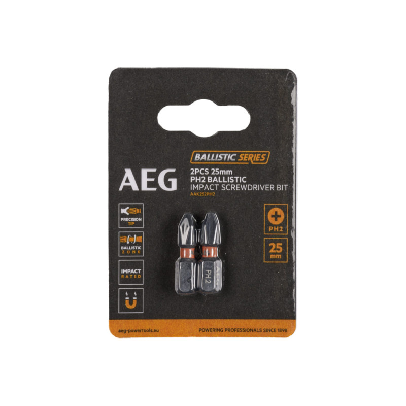Embouts de vissage balistiques renforcés AEG - 25 mm - 2 pcs - PH2, conçus pour fonctionner avec impact lors du montage et du démontage des fixations. En raison de la zone de torsion à couple élevé, la transmission de force est réduite, ce qui se traduit par une longue durée de vie.