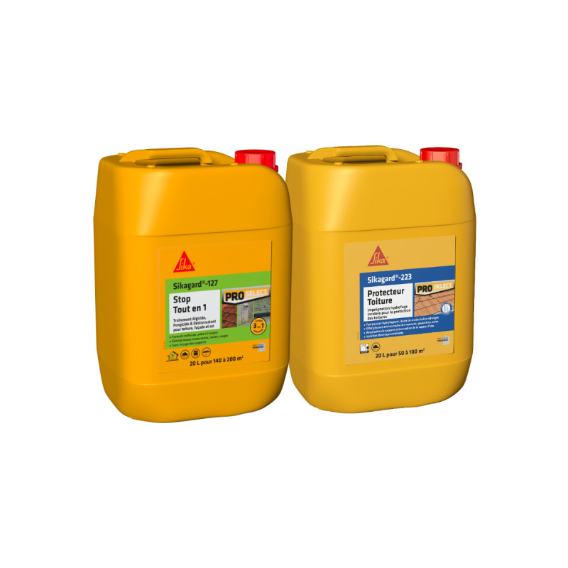 Pack Traitement et Protection Toiture SIKA - Sikagard-127 Stop Tout en 1 20L - Sikagard-223 Protecteur Toiture 20L, pour le traitement et l'imperméabilisation de votre toiture. Le traitement curatif et désincrustant Sikagard-127 Stop Tout en 1 est un traitement anti traces vertes, noires et rouges ultra efficace. Sa formule professionnelle est renforcée en principe actif pour un traitement unique des toitures, façades et sols. Incolore, sans odeur et prêt à l’emploi, il ne nécessite pas de rinçage et s'applique aussi bien horizontalement que verticalement, sur tous les supports et sans laisser de traces. L'hydrofuge Sikagard Protection Toitures a un grand pouvoir hydrofugeant qui améliore la résistance des tuiles à la pénétration des eaux de pluie. Le traitement est incolore après séchage et limite l'accrochage des mousses, des lichens et de la poussière. Possibilité de recouvrir le produit avec une peinture spéciale toitures.