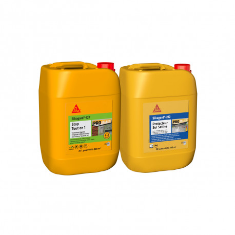 Pack Nettoyage et Protection Sol SIKA - Sikagard-127 Stop 20L - Sikagard-212 Protecteur Sol Satine 20L, idéal pour donner un coup de neuf, un traitement et une protection longue durée à vos sols. Le traitement curatif et désincrustant Sikagard-127 Stop Tout en 1 est un traitement anti traces vertes, noires et rouges, ultra efficace. Sa formule professionnelle est renforcée en principe actif pour un traitement unique des toitures, façades et sols. Incolore, sans odeur et prêt à l’emploi, il ne nécessite pas de rinçage et s'applique aussi bien horizontalement que verticalement, sur tous les supports et sans laisser de traces. L'hydrofuge Sikagard-212 Protecteur Sol Satine est une résine en phase aqueuse prête à l’emploi, résistante aux UV. Ce produit imperméabilise efficacement les supports poreux et les protège contre la pénétration de l’eau, de l’huile et de la plupart de tâches (graisse, salissures, etc). Il agit également comme liant efficace lors d’une utilisation sur des joints de sable. Il pénètre profondément dans le joint, favorise le maintien en place des pavés et les protège des infiltrations. il est adapté aux surfaces en béton, en pierre, en pavés, etc. Idéal pour les espaces piétons, les espaces exposés au trafic de véhicules, aux parking, aux terrasses, balcons, trottoirs, etc.