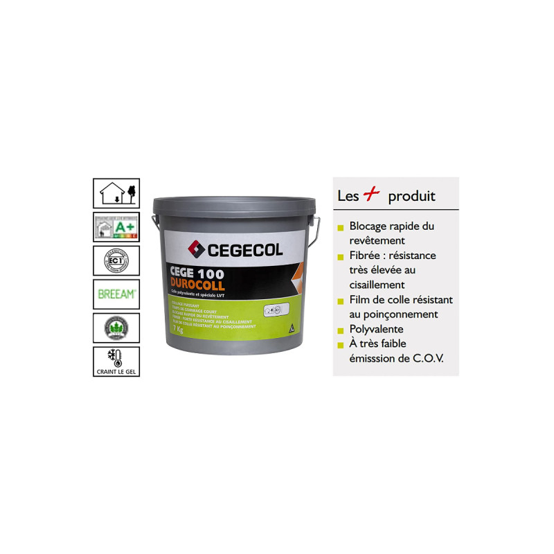 La colle acrylique fibrée spéciale LVT CEGECOL Cege 100 Durocoll est une colle spécialement développée pour le collage de revêtements des sols intérieurs en locaux P2 ou P3. Elle convient pour le collage de LVT en lame et en dalle, le collage de caoutchouc et de linoléum. Cette colle s'applique sur la plupart des supports et s'utilise très facilement.