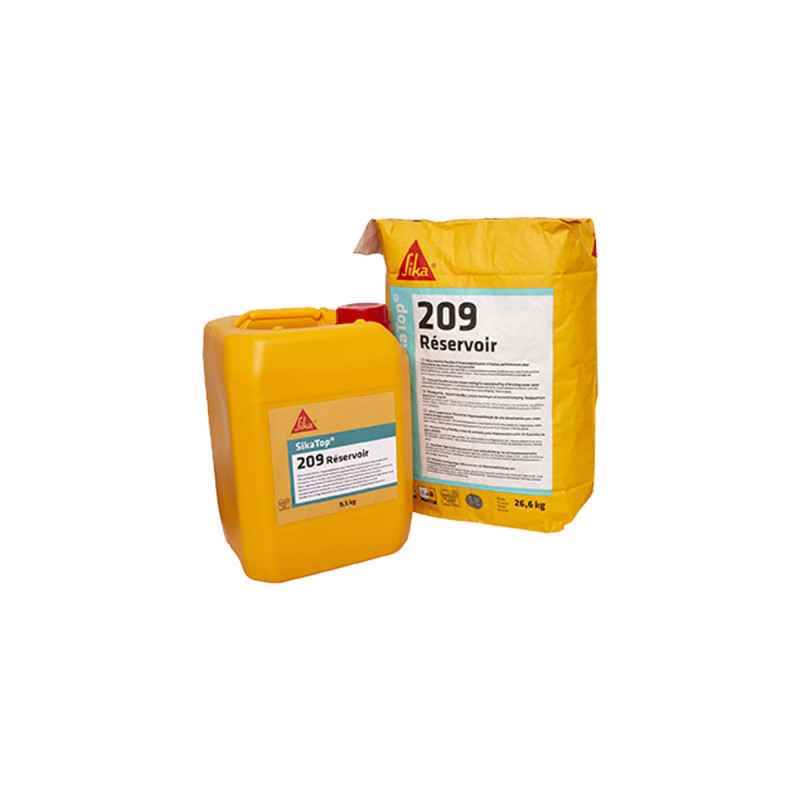 Ce micro-Mortier SIKA SikaTop - 209 Réservoir est un micro-mortier hydraulique présenté en kit prédosé comprenant : composant A (résine en émulsion), composant B (ciment et charges spéciales). Après mélange, on obtient un micro-mortier plastique. Ce produit est un revêtement d’imperméabilisation mince et à flexibilité adapté pour l’étanchéité de réservoirs d’eau destinée ou non à la consommation humaine (réservoirs, bassins, cuves, piscines, aqueducs…), qu’ils soient aériens, enterrés ou semi-enterrés, ouverts ou fermés.