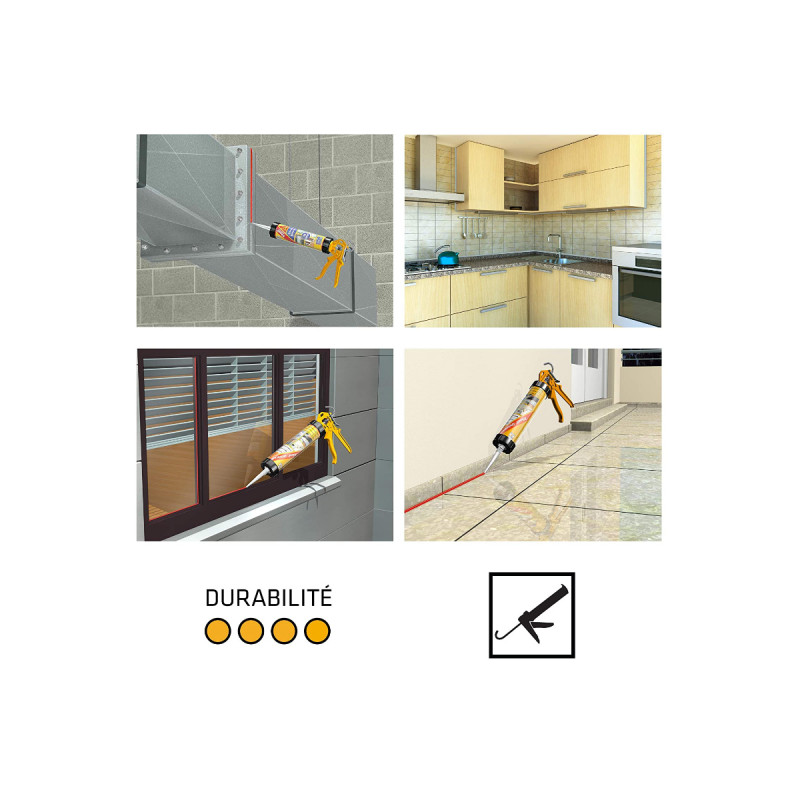 Le mastic silicone SIKA Sikasil construction - Gris - 300ml est un mastic silicone universel permettant de réaliser des joints de construction et de menuiserie en intérieur et extérieur. S'applique et se lisse parfaitement pour un rendu propre et net. Il a une bonne adhérence sans primaire sur béton, mortier de ciment, aluminium, verre non traité, cuivre, acier, zinc, carrelage, émail et la plupart des bois vernis, imprégnés ou peints, PVC rigides, etc.