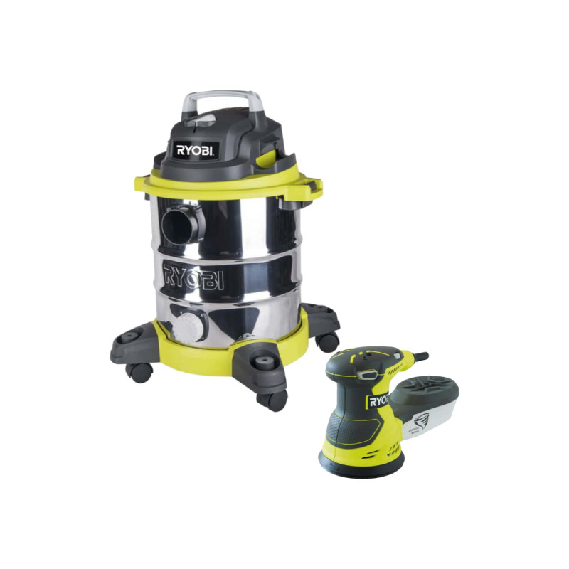Le pack RYOBI contient un aspirateur eau et poussière et une ponceuse excentrique électrique idéal pour réaliser des travaux de ponçage sans laisser de traces de poussières. Avec son puissant moteur de 300 W, vous pourrez poncer efficacement différentes surfaces. Elle dispose d'une poignée micro-alvéolée GripZone permettant d'avoir un meilleur confort d'utilisation et d'une meilleure prise en main. Après vos activités de ponçage, vous pourrez utiliser l'aspirateur eau et poussière. Doté d'un puissant moteur de 1250 W couplé avec sa cuve en inox de 20 L, l'aspirateur possède ainsi une meilleure résistance et de longévité. Elle dispose également d'une grande capacité pour nettoyer même après plusieurs projets.