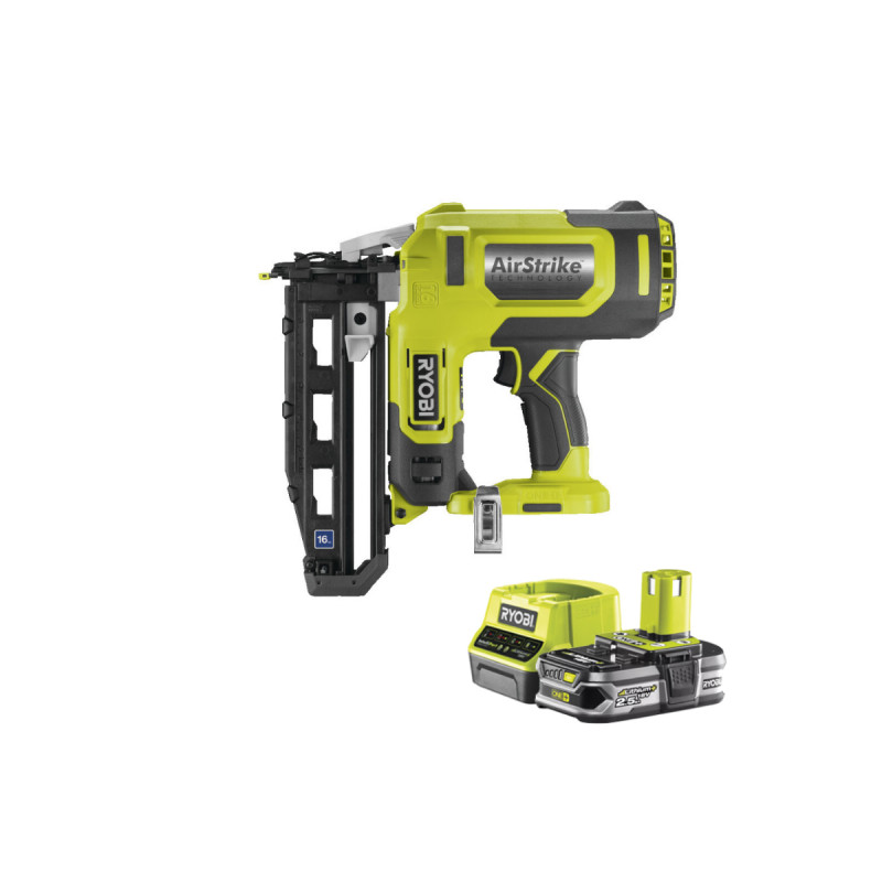 Pack RYOBI Cloueur de finition à air comprimé 18 V One+ R16GN18-0 - 1 Batterie 2.5Ah - 1 Chargeur rapide RC18120-125, avec un cloueur qui possède la technologie AirStrike et vous évite de vous encombrer avec un compresseur ou d'utiliser des cartouches à gaz. Le chargeur peut contenir jusqu'à 100 clous de 19 à 64 mm de long et 1,6 mm de large. Le cloueur est doté d'une libération pratique des pointes piégés et il ne tire pas si le chargeur est vide. Une lumière LED se trouve à l'avant afin de vous éclairer si la zone de travail est sombre.