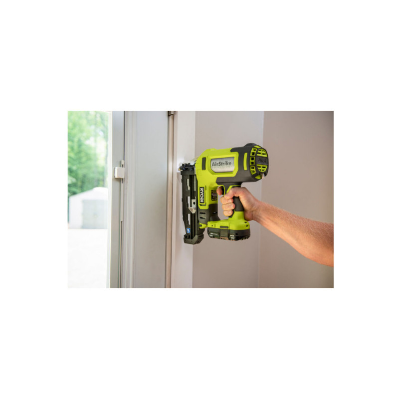 Pack RYOBI Cloueur de finition à air comprimé 18V One+ R16GN18-0 - 1 Batterie 4.0Ah - 1 Chargeur rapide RC18120-140, avec un cloueur qui possède la technologie AirStrike et vous évite de vous encombrer avec un compresseur ou d'utiliser des cartouches à gaz. Le chargeur peut contenir jusqu'à 100 clous de 19 à 64 mm de long et 1,6 mm de large. Le cloueur est doté d'une libération pratique des pointes piégés et il ne tire pas si le chargeur est vide. Une lumière LED se trouve à l'avant afin de vous éclairer si la zone de travail est sombre.