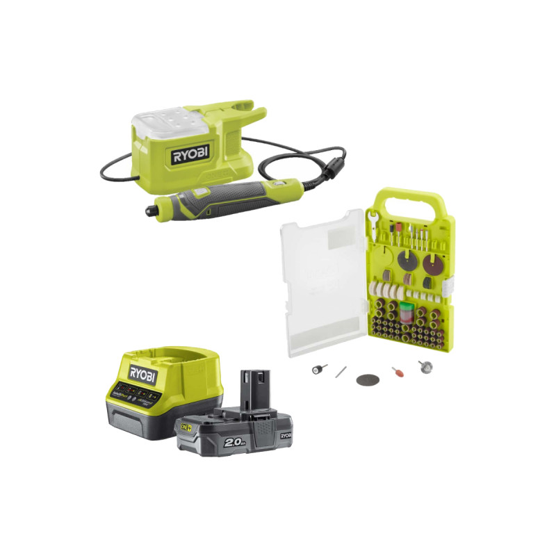 Le pack RYOBI - Mini outil multifonction 18V One+ RRT18-0 - Kit 155 accessoires - 1 batterie 2.0Ah - 1 chargeur, est idéal et complet pour réaliser tout type de petits travaux comme des petites découpes et perçages. L'outil multifonction est petit et compact, et la vitesse réglable de 4400 à 23000 tr/min par une molette s'adapte à vos besoins. Il possède déjà 15 accessoires, mais le kit de 155 accessoires permet de multiplier les usages possibles. Une batterie et un chargeur rapide inclus dans le pack accompagnera tous vos outils Ryobi 18V One+ et offrent aux outils une grande autonomie.
