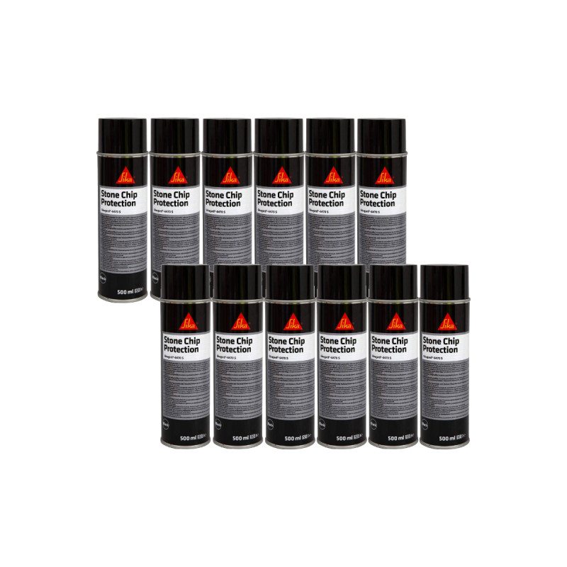 Lot de 12 revêtements anti-gravillons SIKA Sikagard 6470 S - Noir - 500ml est un revêtement de protection anti-corrosion en aérosol destiné à la réparation d'urgence et à la protection des pièces de véhicules peintes vulnérables (bas de caisse, passages de roues, tabliers avants et arrières). Il peut également être appliqué en tant qu'insonorisant afin de réduire les bruits sur certaines pièces, comme les passages de roues.